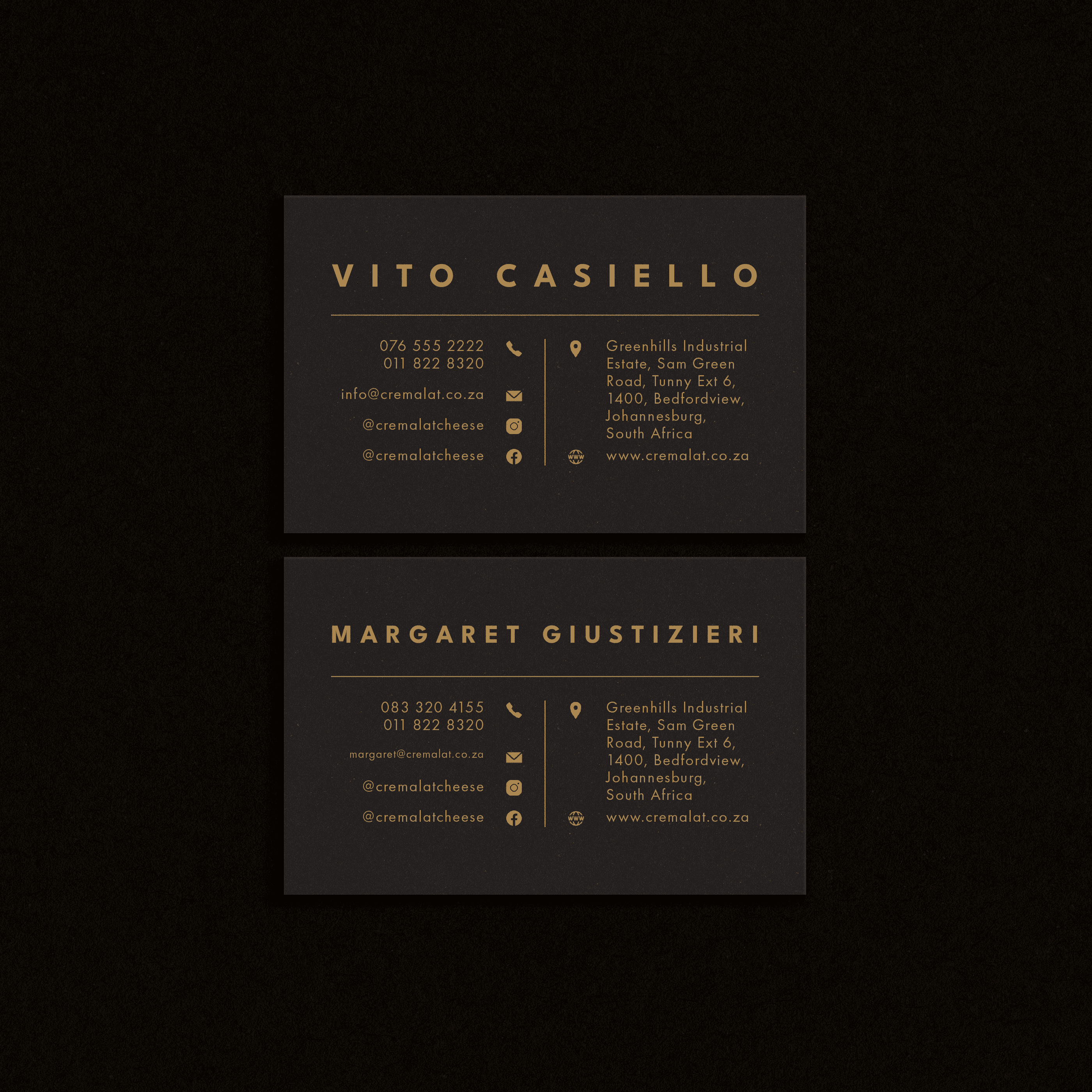 Since 1992, Cremalat is proudly an Authentic Italian Delicatessen offering to the loyal clients a wide selection of the best Italian products. Cremalat approached me to redesign their business cards which would be used across their various delis in Johannesburg.